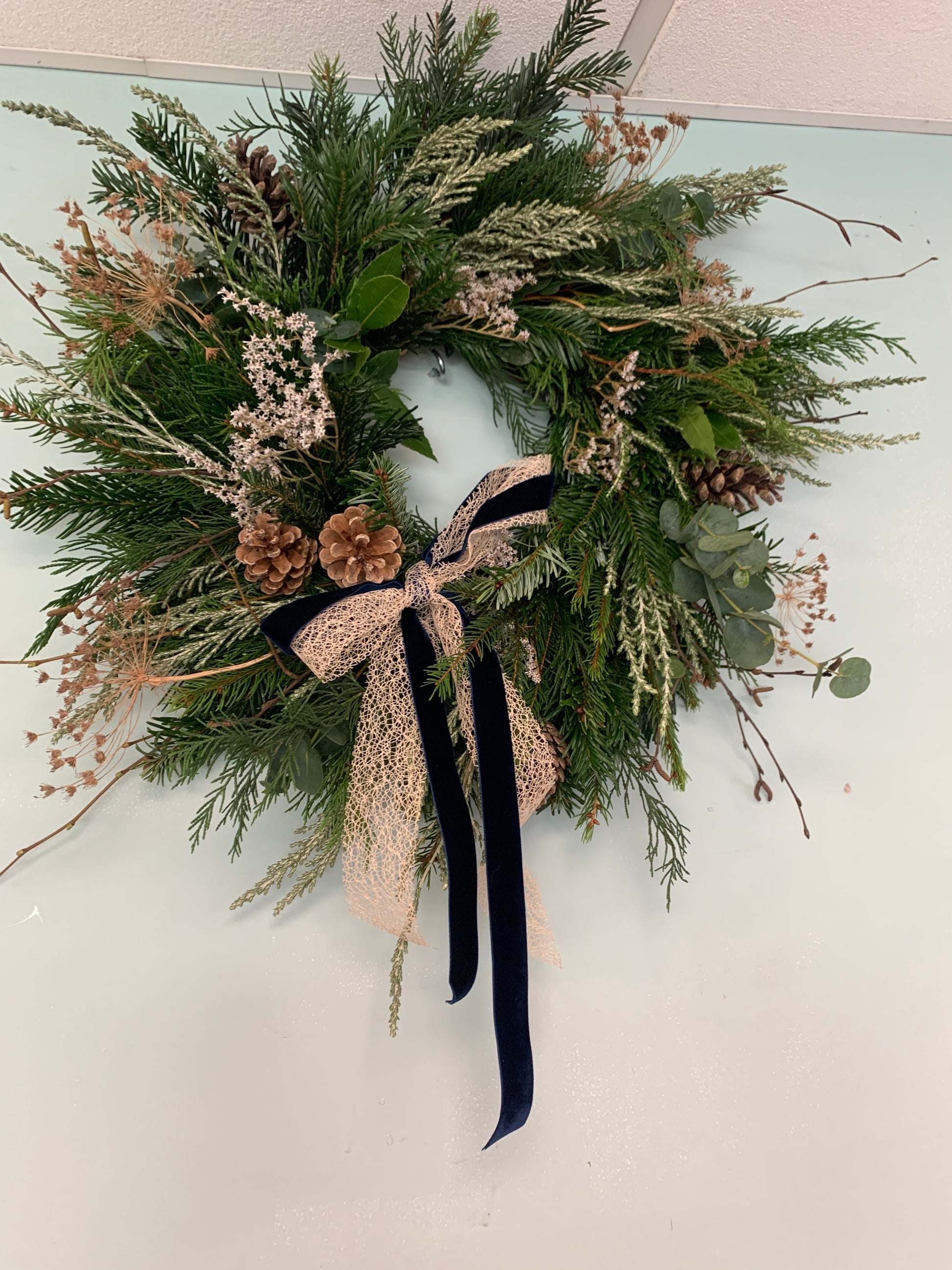 A deluxe Christmas wreath from Sow Grateful handmade with a beautiful mix of seasonal, local foliage and decorated with pine cones, dried flowers, seedheads and deluxe ribbon.
